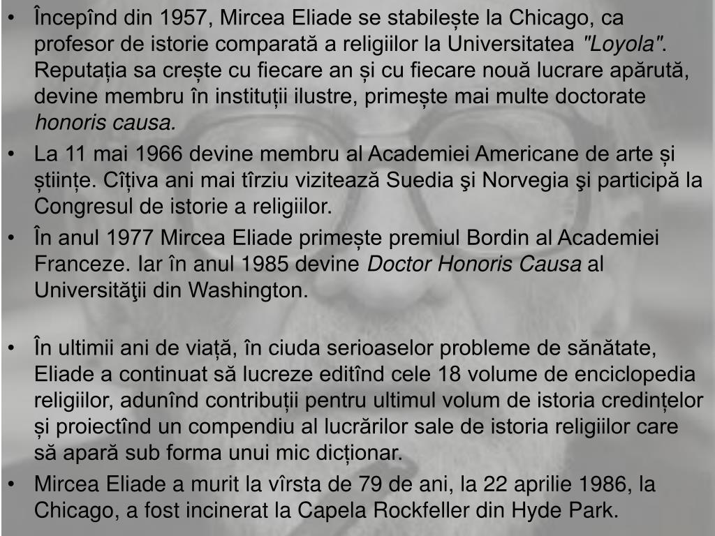 Mircea eliade şi istoria religiilor pentru mircea eliade, istoria religiilor urmăreşte identificarea prezenţei transcendentului în experienţa umană sau descoperirea hierofaniilor, a manifestărilor sacrului în lume... Tatal lui, fiind deosebit de religios, a inregistrat nasterea fiului sau cu 4 zile inainte de data reala, ca sa corespunda astfel cu sarbatoarea celor patru martiri din sebasta. 20.09.2017 · pe mircea eliade termenul însuşi de religie îl cam incomodează cu timpul, preferînd să vorbească mai degrabă despre „credinţe religioase" şi „idei religioase".